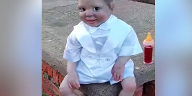 Esta aterradora e inquietante ilusión óptica ha llamado la atención de todos en las redes, ya que, cuando la cámara se mueve de un lado a otro el bebé vampiro parece que la siguiera con la mirada. En las redes sociales ya lo han bautizado como el ‘muñeco diabólico’ y, por si fuera poco, aparece con una botella al costado, cuyo líquido rojo podría ser la sangre que lo alimenta o simplemente el accesorio del espeluznante juguete.