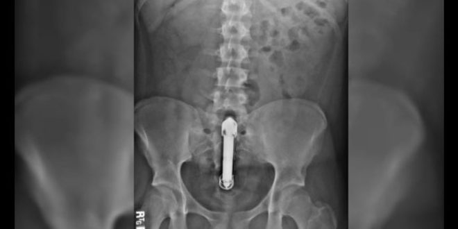 Con la policía presente, el individuo que aparentaba algún desorden mental, pedía que se llame a los médicos, mientras esbozaba gritos de dolor. Además, hacía ademanes para intentar sacarse el artefacto por sus propios medios.