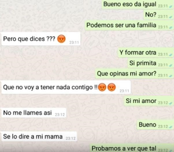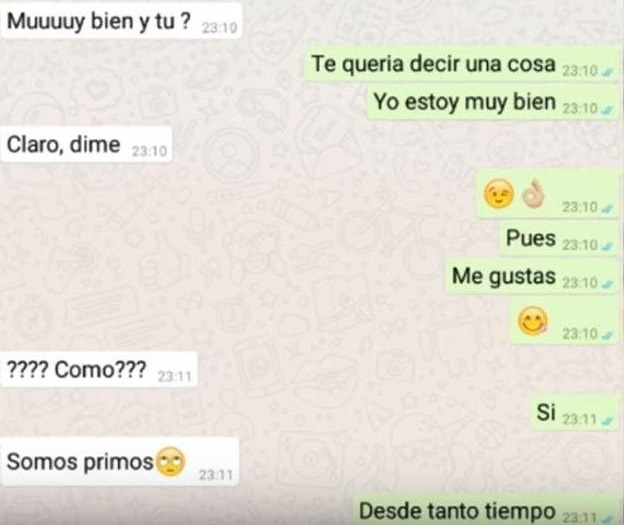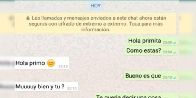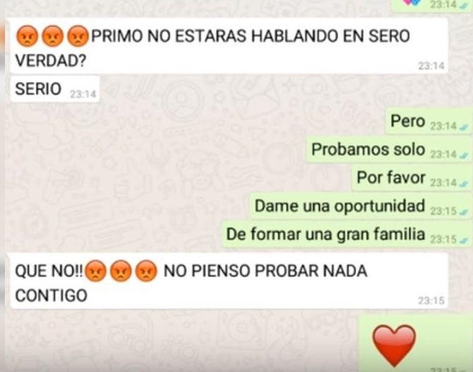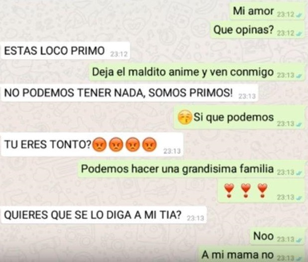 “Me gustas”, fue la frase que el chico le envió a su prima por WhatsApp. Ella quedó en shock con esta declaración y le dijo que deje de molestarla, de lo contrario se lo diría a su mamá, la tía del muchacho.