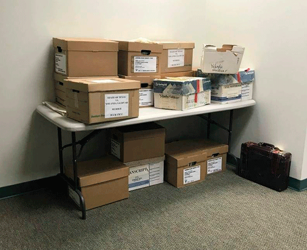 Valdez mostró 16 cajas que llevan la etiqueta “State of Texas vs Yolanda Saldivar”, y en su interior guardan la mayoría de pruebas que presentaron a la fiscalía para declarar culpable a Saldivar.