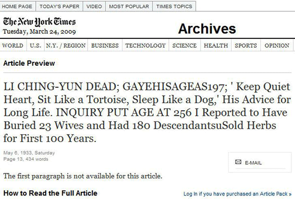 El 6 de Mayo de 1933, en la página 13 del periódico The New York Times, aparecía la esquela de Li Ching-Yuen, un chino que acababa de fallecer a los 256 años, y que había dejado 180 hijos de 23 esposas.