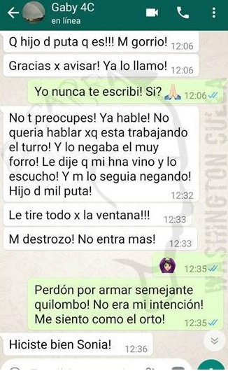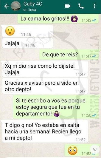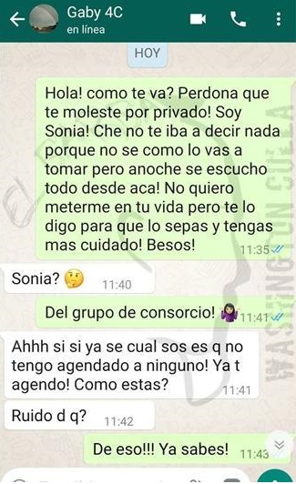 Todo comenzó cuando Sonia, como se llama la vecina, se comunicó por WhatsApp con “Gaby” y le pidió encarecidamente que hagan menos ruido cuando tenga relaciones sexuales con su esposo, ya que los gritos son insoportables.